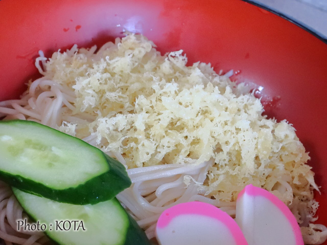 かまぼこ・錦糸・キュウリは同じ丈の千切りに整えてあって、3色揃って美しい。