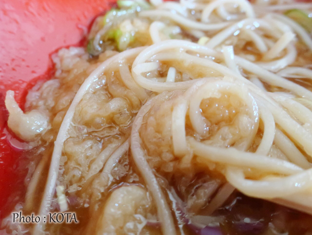 そばが、きりっとしたおつゆ、天かすの油と香りを引き連れ、口の中はふくよかな旨味でいっぱいに。