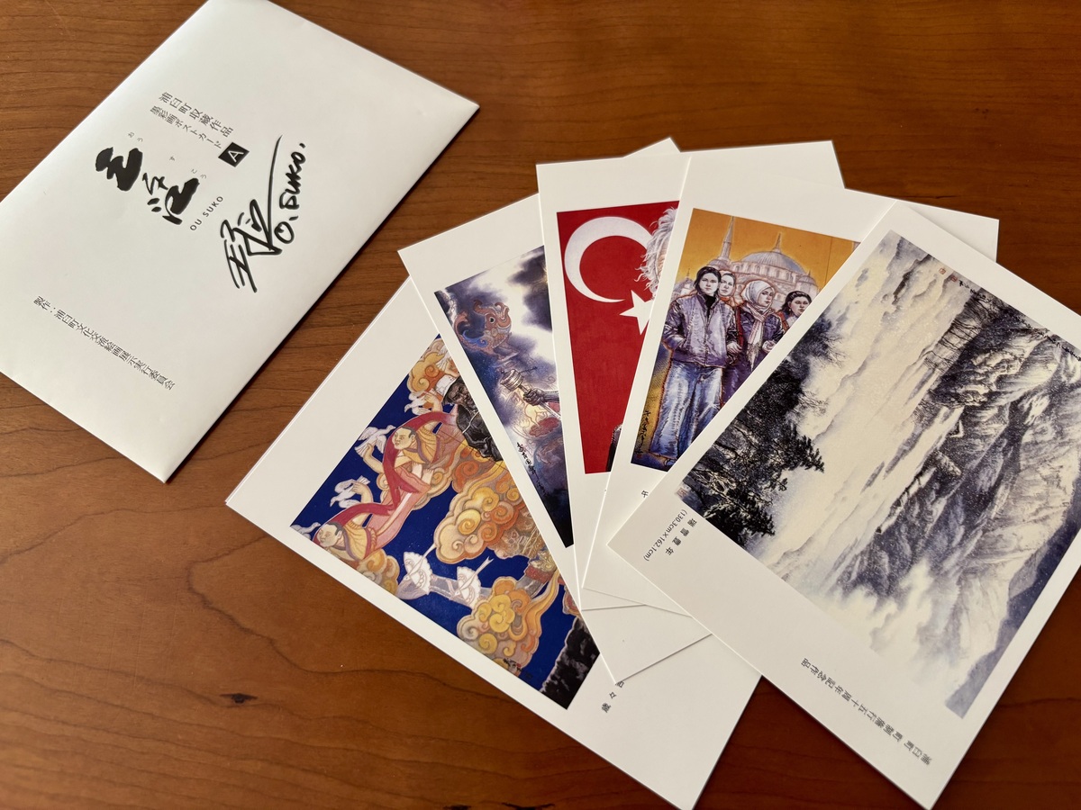 写真2枚目のポストカードは、浦臼町と縁のある水墨画家の「王子江(おうすこう)」さんによるもので、税込¥500で買うことができますよ。