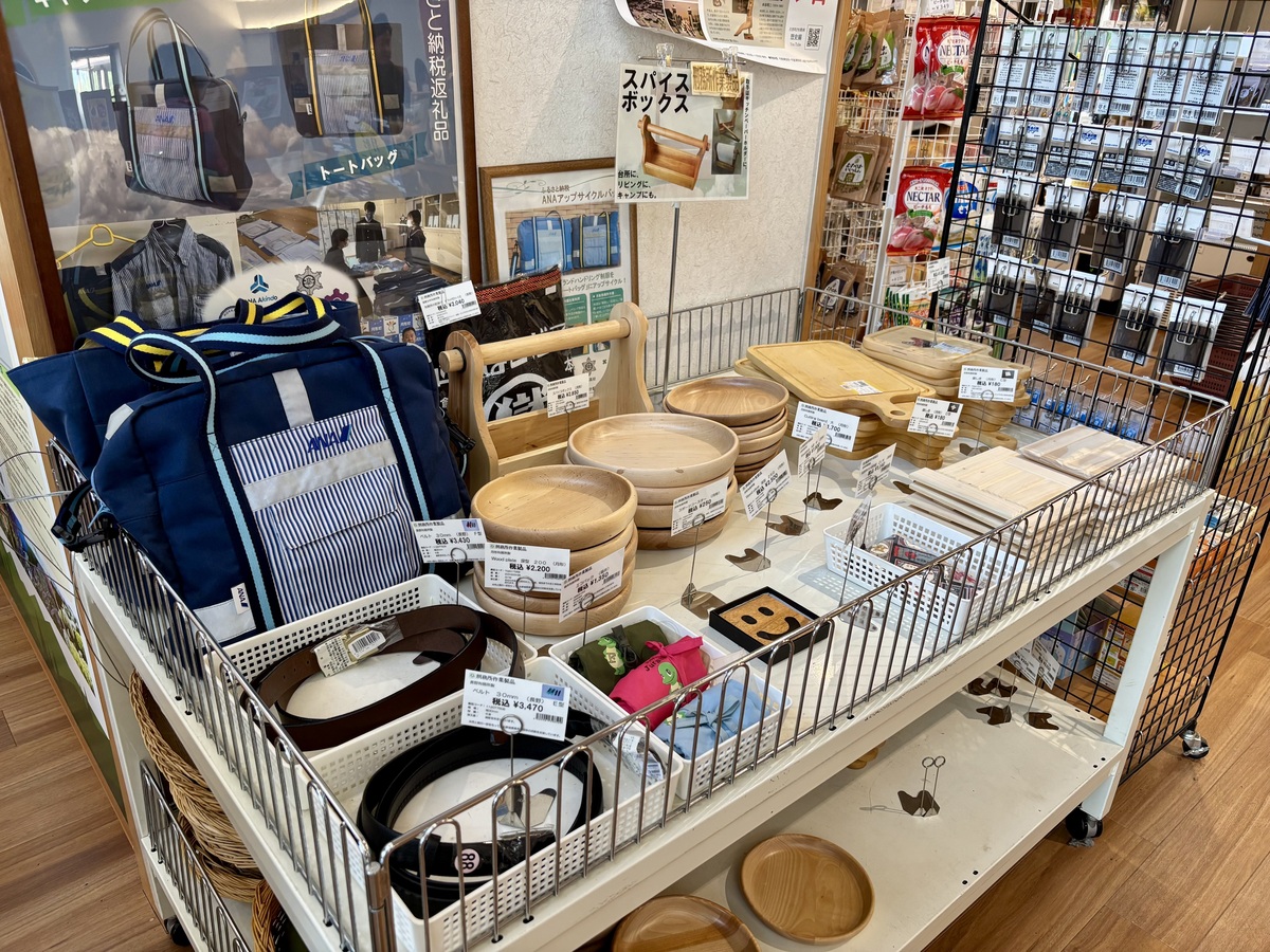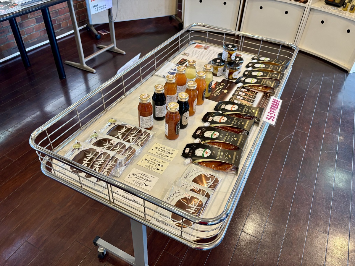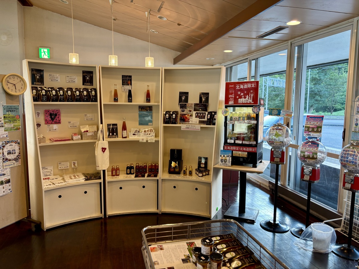 施設内には、ブレンドコーヒーやトマトジュースなどの食品、さらには温泉タオルやTシャツといった雑貨まで、さまざまな浦臼町の特産品が販売されております。