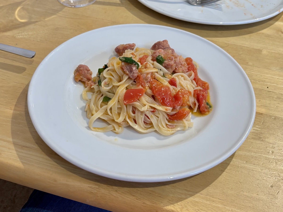 サルシッチャ(イタリア生ソーセージ)の上品な脂と、完熟プチぷよの天然の甘さが、コシのある平打ち麺とも相性はバツグン!