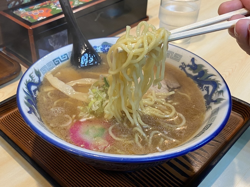 動物系のスープに魚介類を合わせたダブルスープで、昔ながらの旭川しょうゆラーメンです。