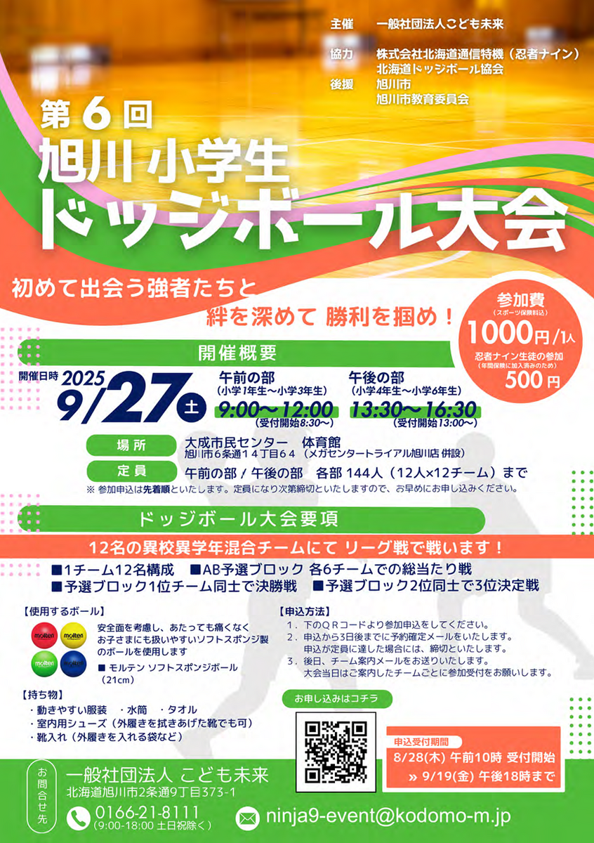 2025年9月27日(土)に大成市民センターで『第6回 旭川 小学生ドッジボール大会』が開催されます。