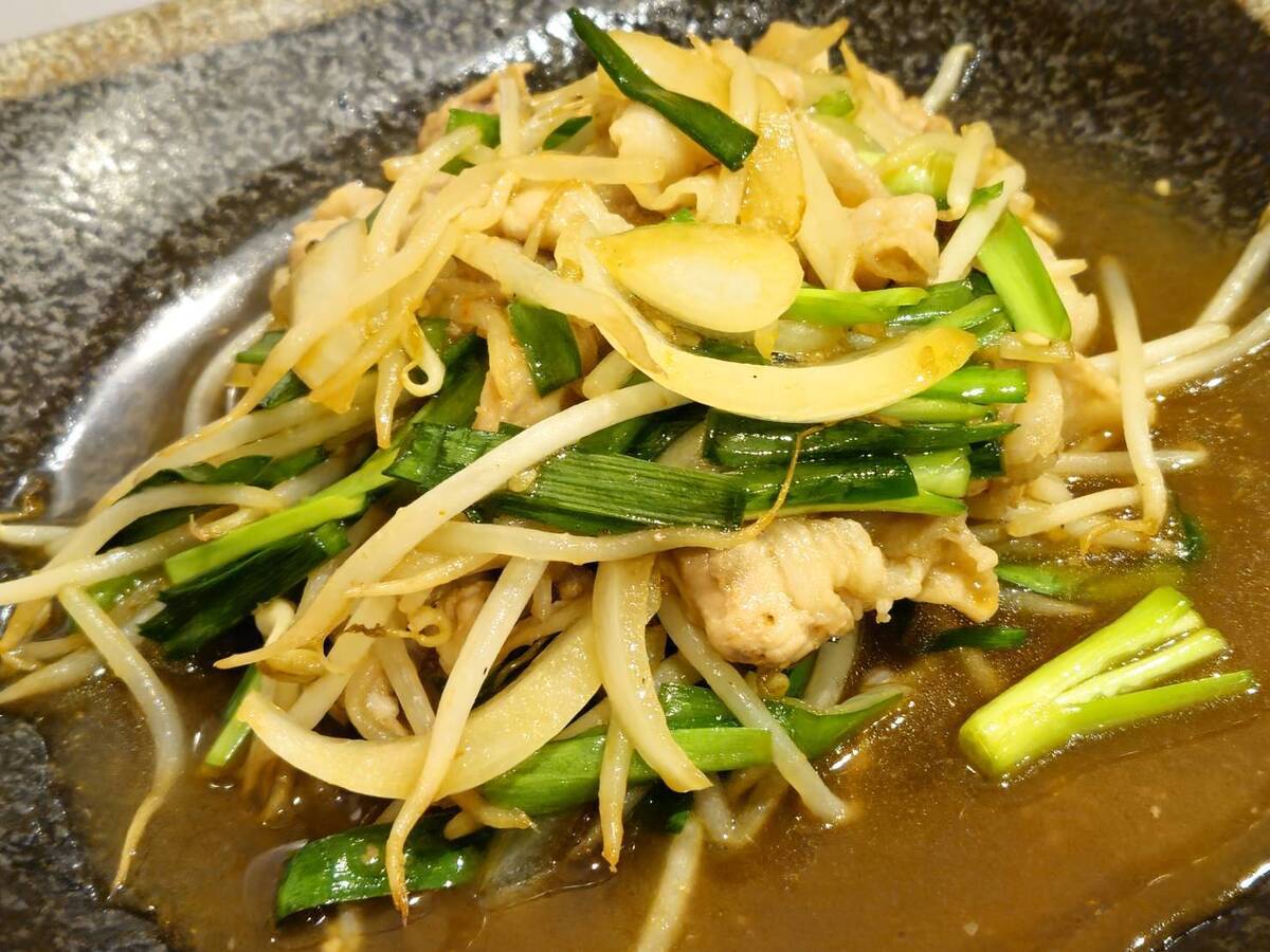 豚肉、もやし、たまねぎ、ニラなどを炒めた野菜たっぷりの焼き肉。