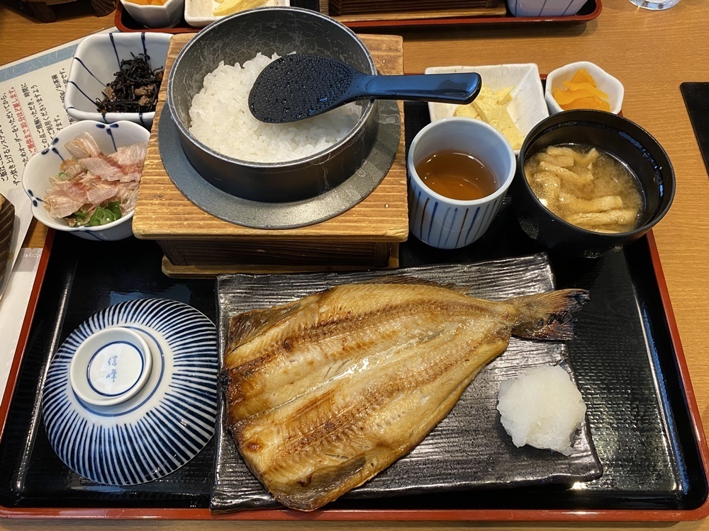 注文した「縞ホッケご膳」には、縞ホッケの開きに釜炊きのごはん、お味噌汁、玉子焼き、ひじきの煮物、オクラのお浸し、お漬物と豪華です。