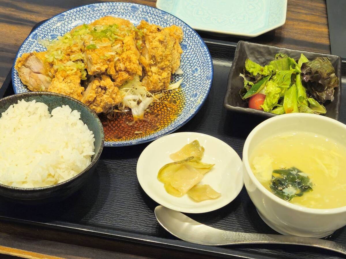 メインの油淋鶏、ごはん、サラダ、ザーサイ、たまごスープがセットになっています。