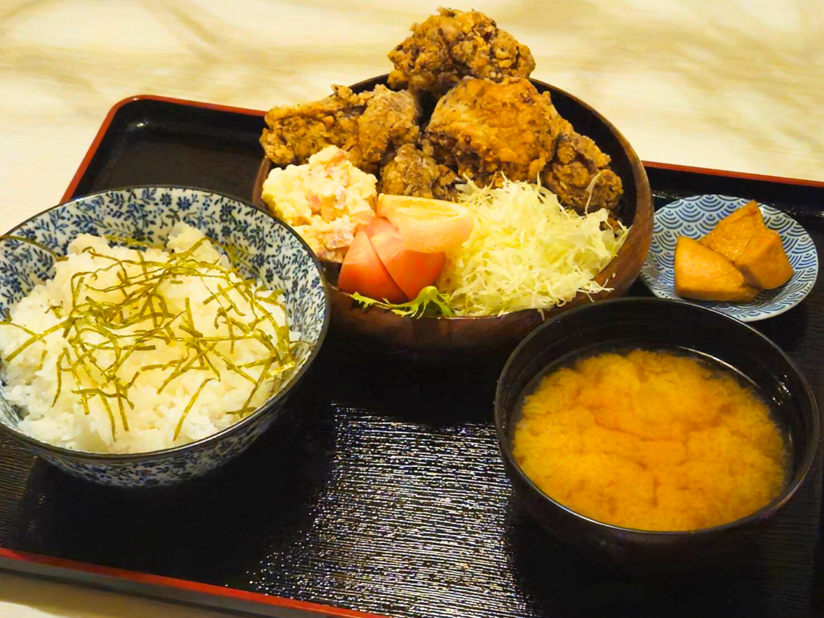 メインのザンギ、ごはん、小鉢、お味噌汁がセットです。