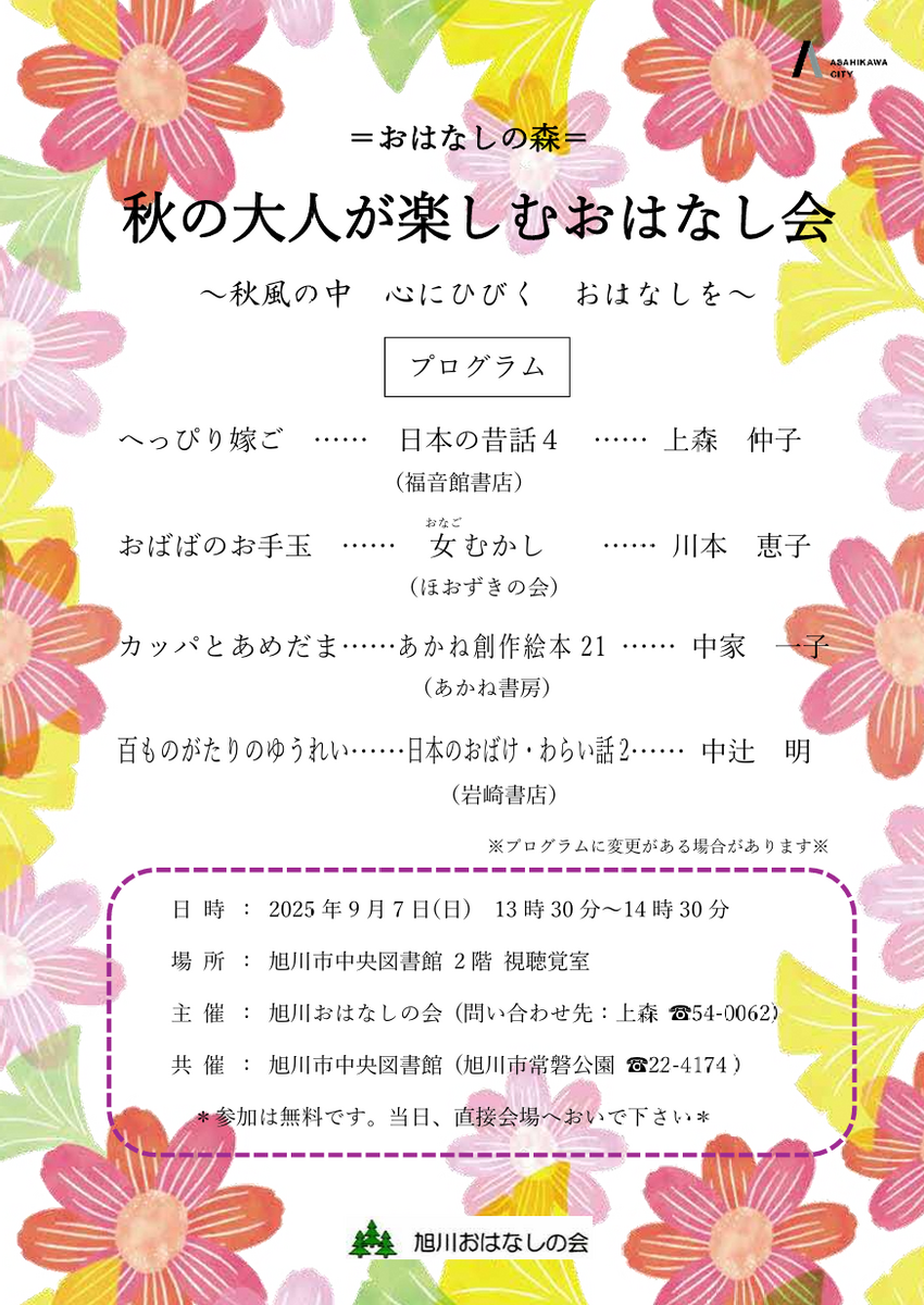 【9月7日】旭川市中央図書館で秋の大人が楽しむおはなし会開催