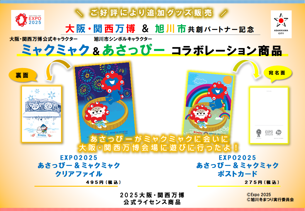 大阪・関西万博公式キャラクター「ミャクミャク」と旭川シンボルキャラクター「あさっぴー」は、旭川冬まつり会場や2025大阪・関西万博オフィシャルストアでのグリーティングイベントの開催、ピンバッジ・ぬいぐるみなどのコラボレーショングッズの販売など、2つのイベントを盛り上げようと、様々な交流を続けて参りました。