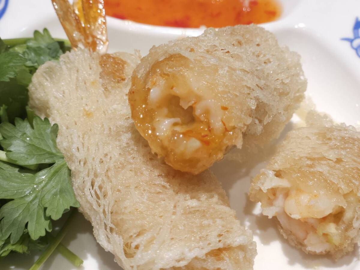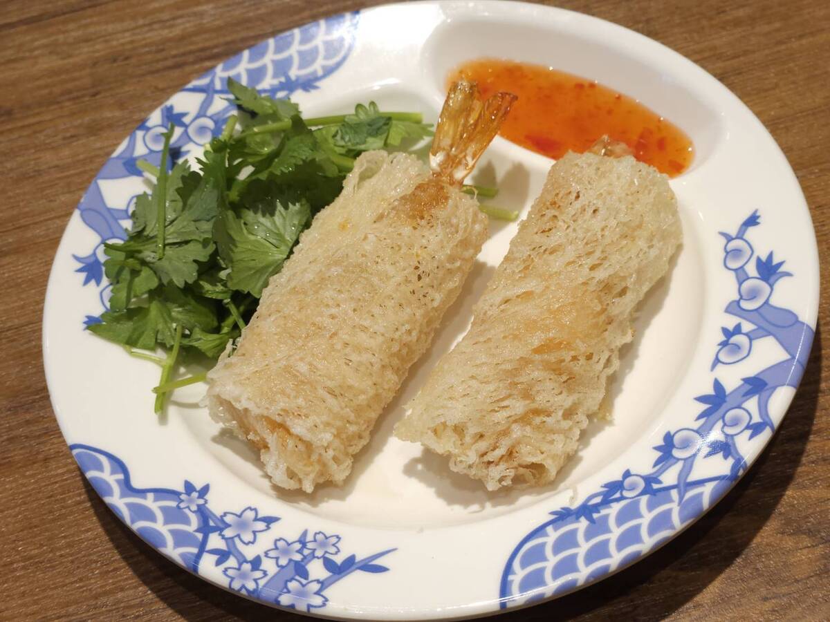 ライスペーパーで巻かれて揚げた海老が2尾にパクチーが添えられています。