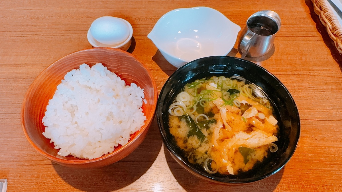 大きなお椀の味噌汁と、卵かけご飯が300円以下で食べられ、フリーWi-Fiあり、快適なソファ。