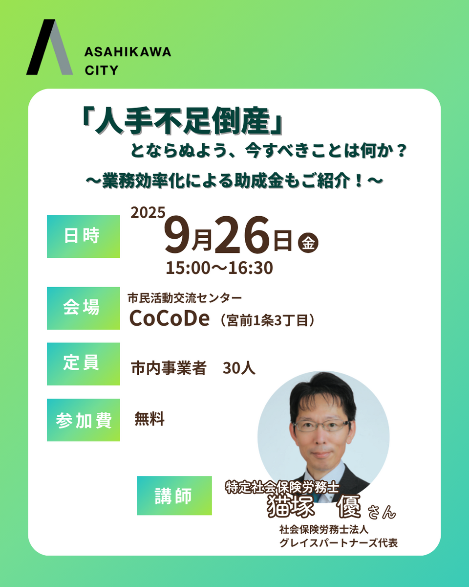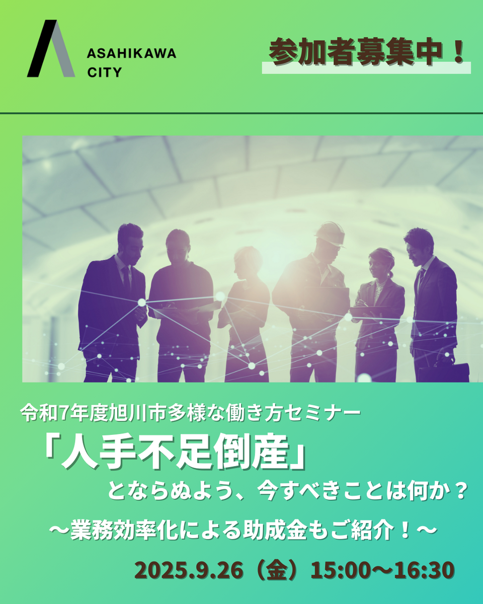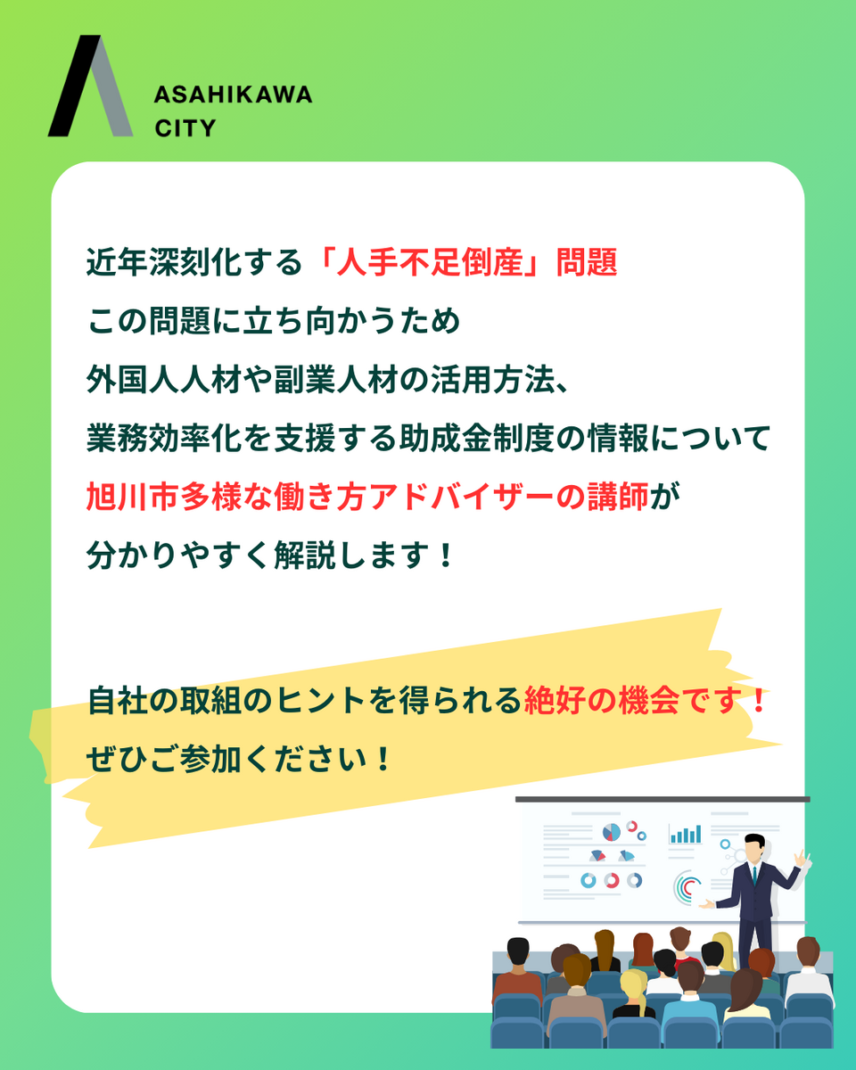 旭川市多様な働き方セミナーでは、近年深刻化する人手不足倒産の解決策として、