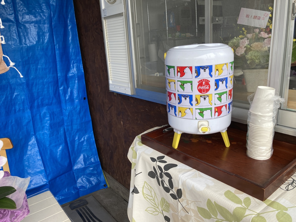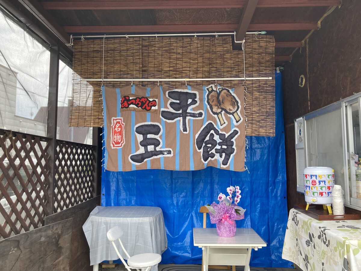 テイクアウトのお店ですが、お店の前に椅子とお茶?も置いてありました。五平餅は注文が入ってからたれを塗ってくれるのでこちらで座って待つこともできます。