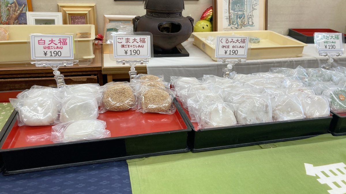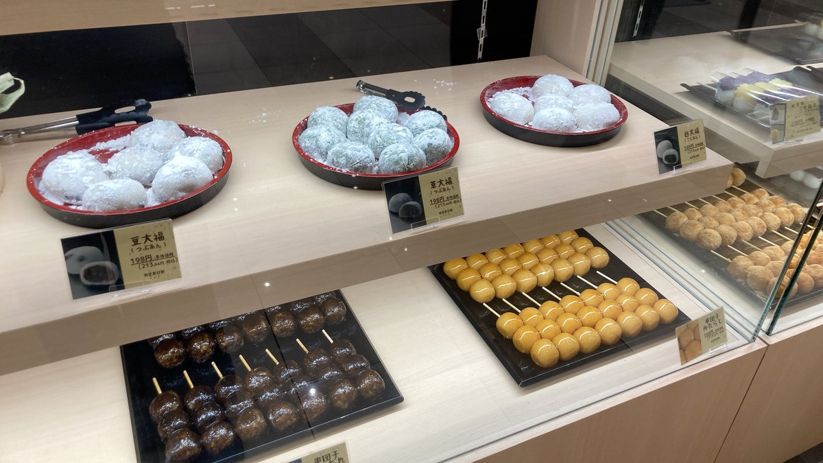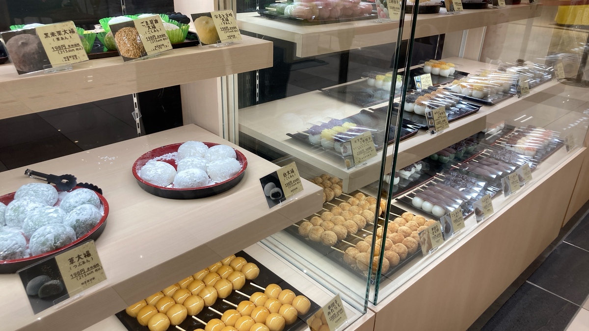 ショーケースには、大福や串団子、見た目が華やかな餡細工の団子など、多彩な和菓子が沢山並びます。