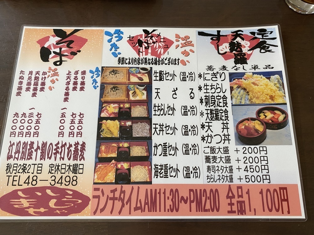 ランチメニューは寿司・天ぷら・定食・そば・セットなど種類が豊富で、全品1,100円です。