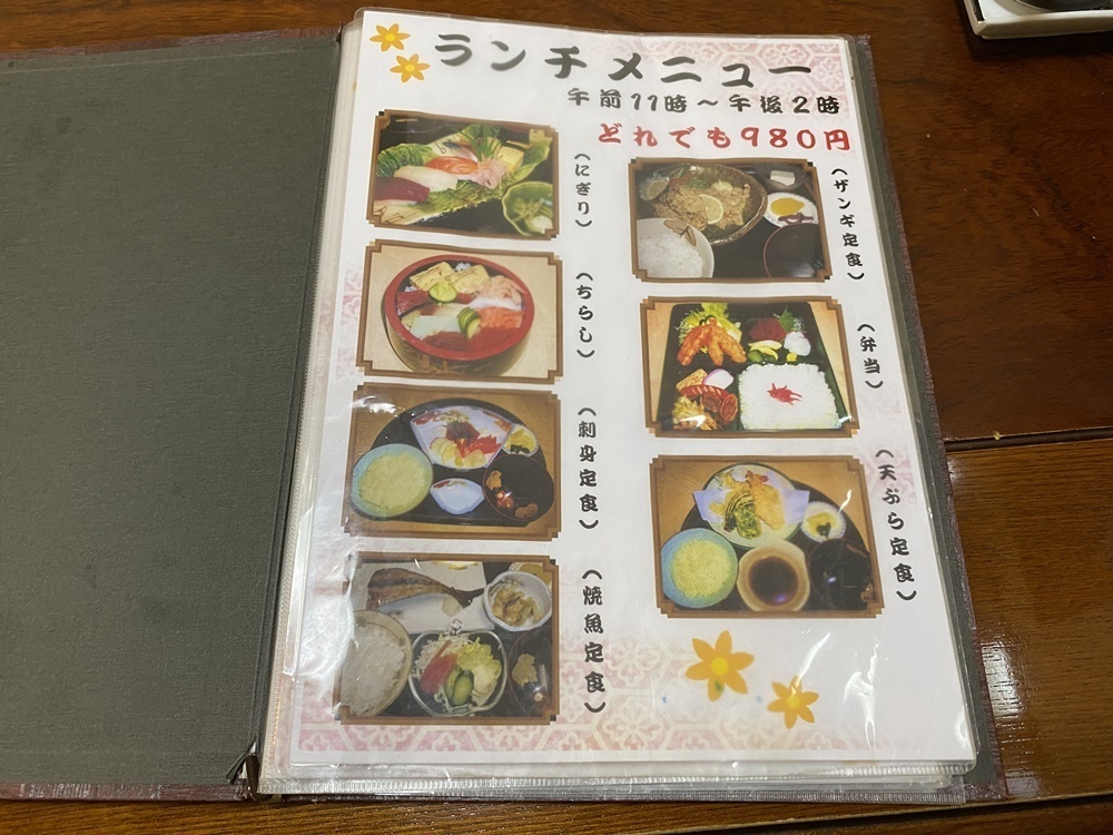 ランチメニューは、にぎり鮨や生ちらし鮨、刺身定食、焼魚定食、ザンギ定食などの7種類で、すべて税込み980円。