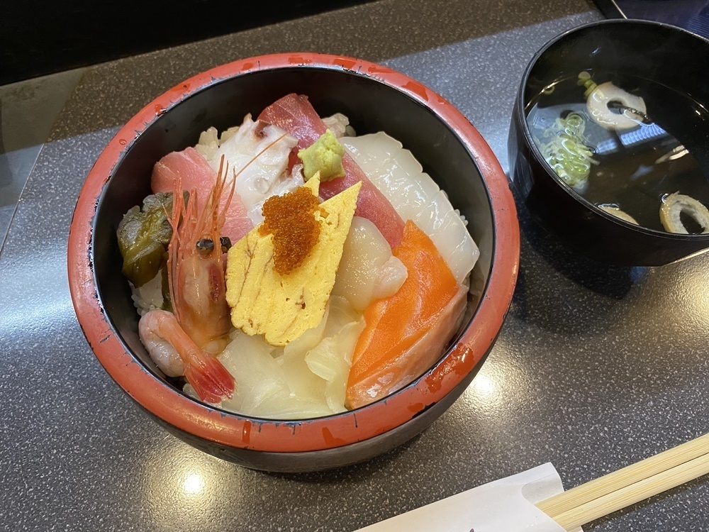 生ちらしのネタは、マグロ、サーモン、イカ、タコ、ホタテ、甘エビ、玉子、とびっこで、ガリの他に漬物も添えられています。
