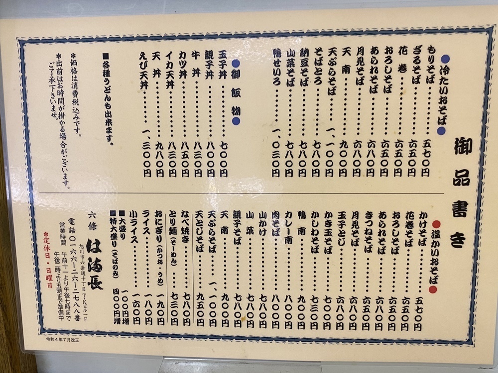 「そば源 三番舘店」と「味処 家族亭」では、お得なセットメニューを紹介しましたが、「は満長 六條支店」のお品書きにはセットメニューがありません。