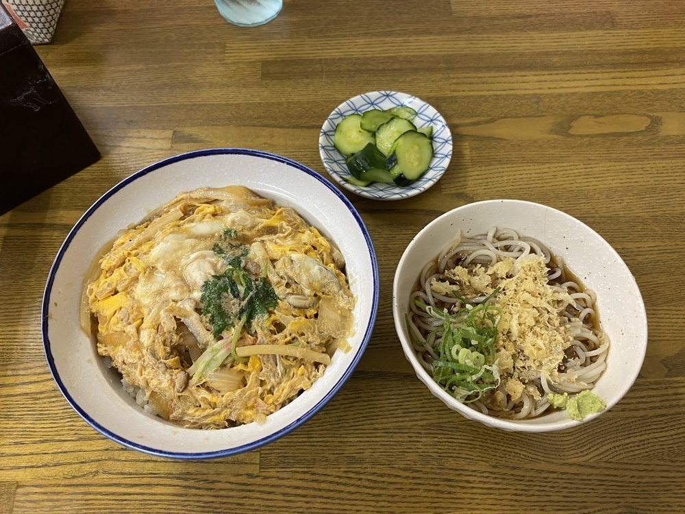 かつ丼は、出汁の効いたタレが、玉子やとんかつ、ごはんにしっかりと浸みこんでいます。そばのつゆもしっかりと出汁が香っていておいしい。