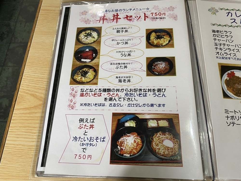 「丼丼セット」は、親子丼・かつ丼・うな丼・ぶた丼・海老丼の5種類の丼ものと、そばやうどんのセットで750円と超リーズナブル。