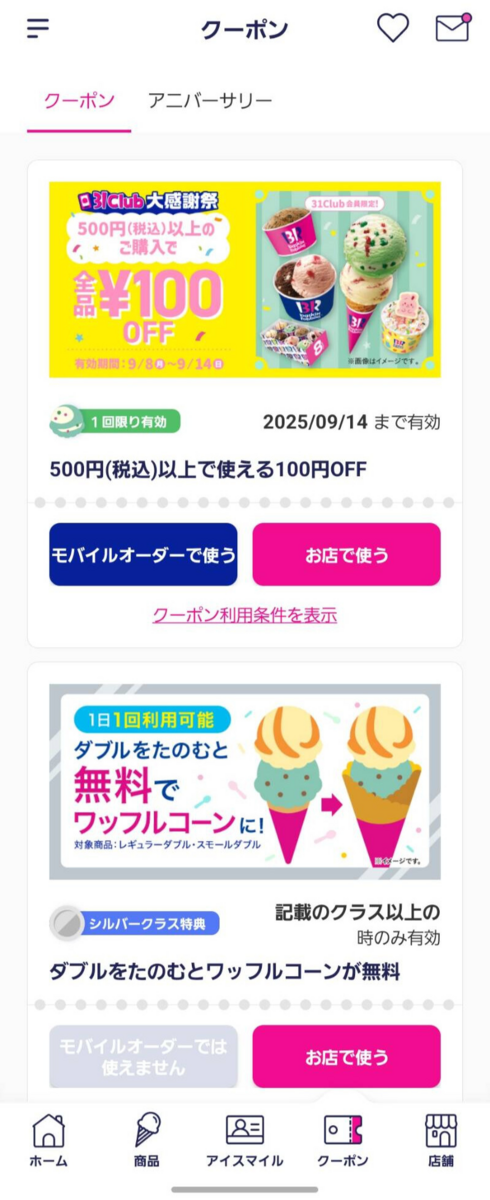 サーティワンの専用アプリにはかなりお得なクーポンがあるんです。