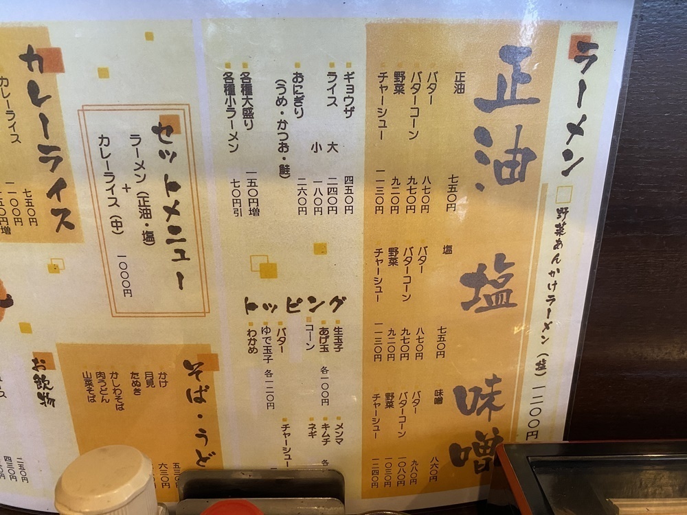 ラーメンは、正油・塩・味噌のそれぞれに、バター、バターコーン、野菜、チャーシューとバリエーションが豊富で、何を食べようか迷ってしまいます。