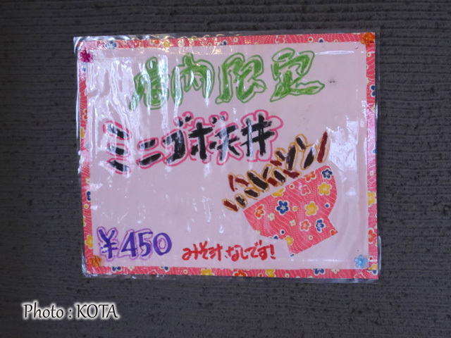 サイドメニューとは書いてないが、ミニ、みそ汁なし・・・、どう考えてもおそばと一緒にどうぞという立ち位置。