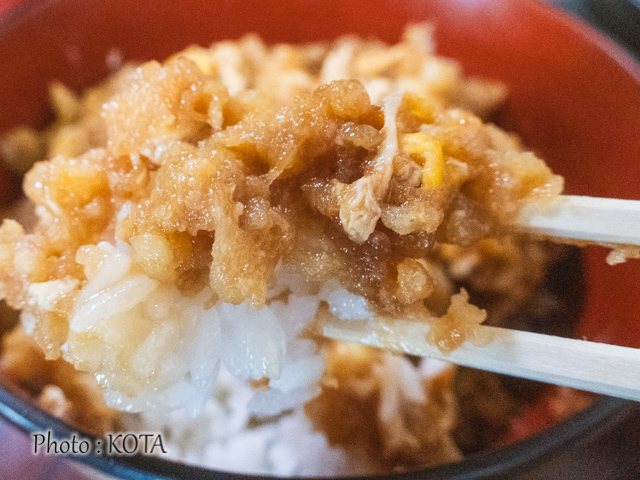 天かすとじは、ふわふわプルンな仕上がりで、ゴハンによく絡む。