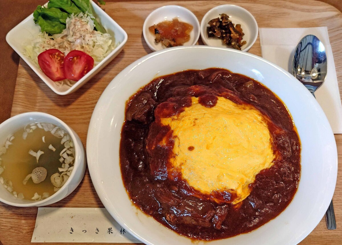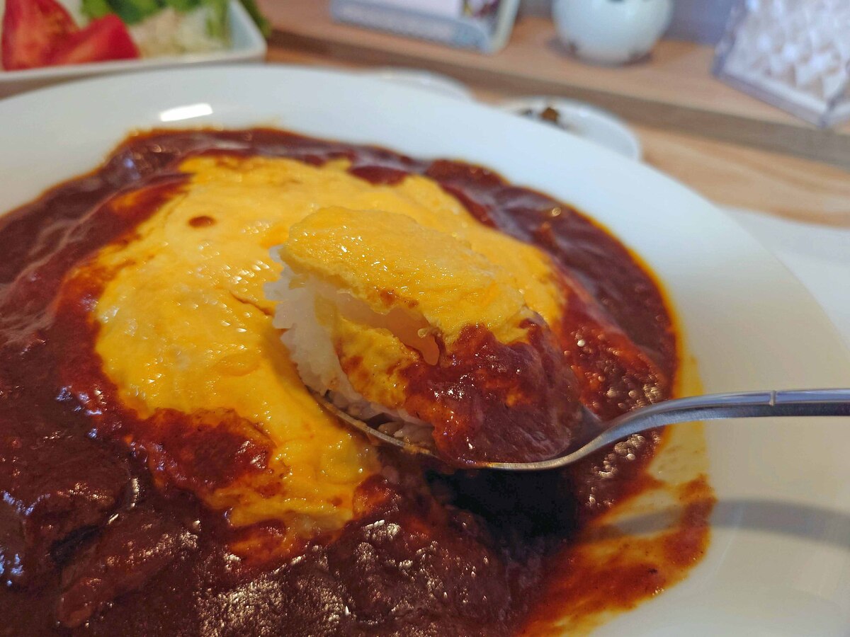 綺麗な黄色のふわっふわなオムに煮込まれたカレーが良い感じ。