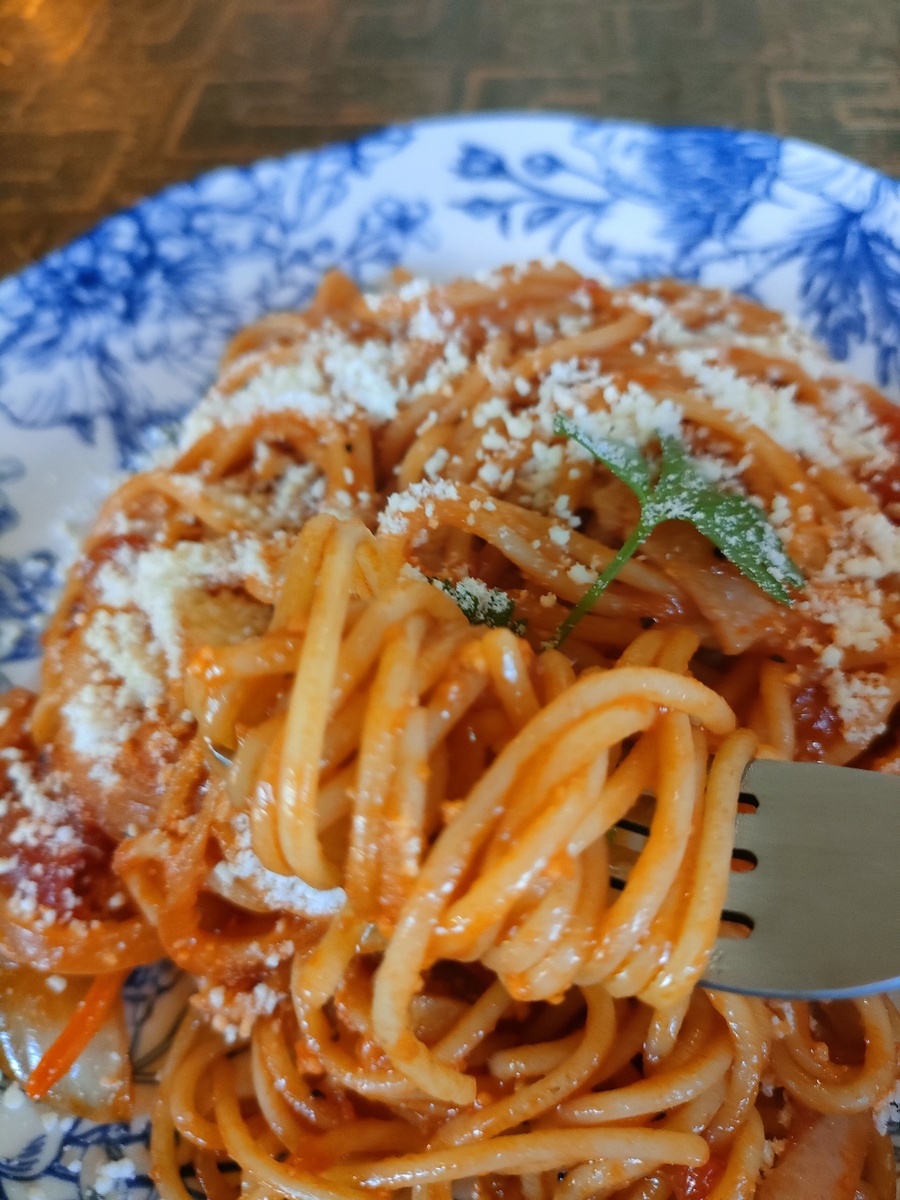 具材はトマトのほか、玉ねぎやベーコンなど、見た感じは王道なナポリタンです。