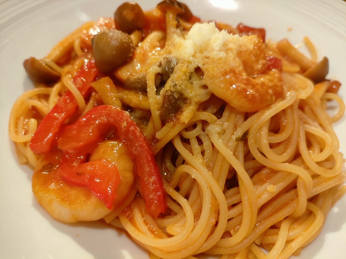 エビとキノコが入っていて、見た目はトマトクリームパスタみたいですね。