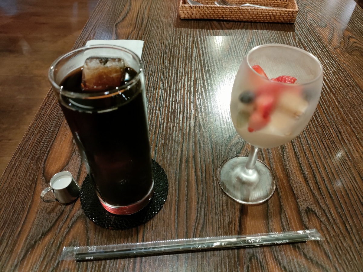 デザートはフルーツカスタード、ドリンクはアイスコーヒーにしました。