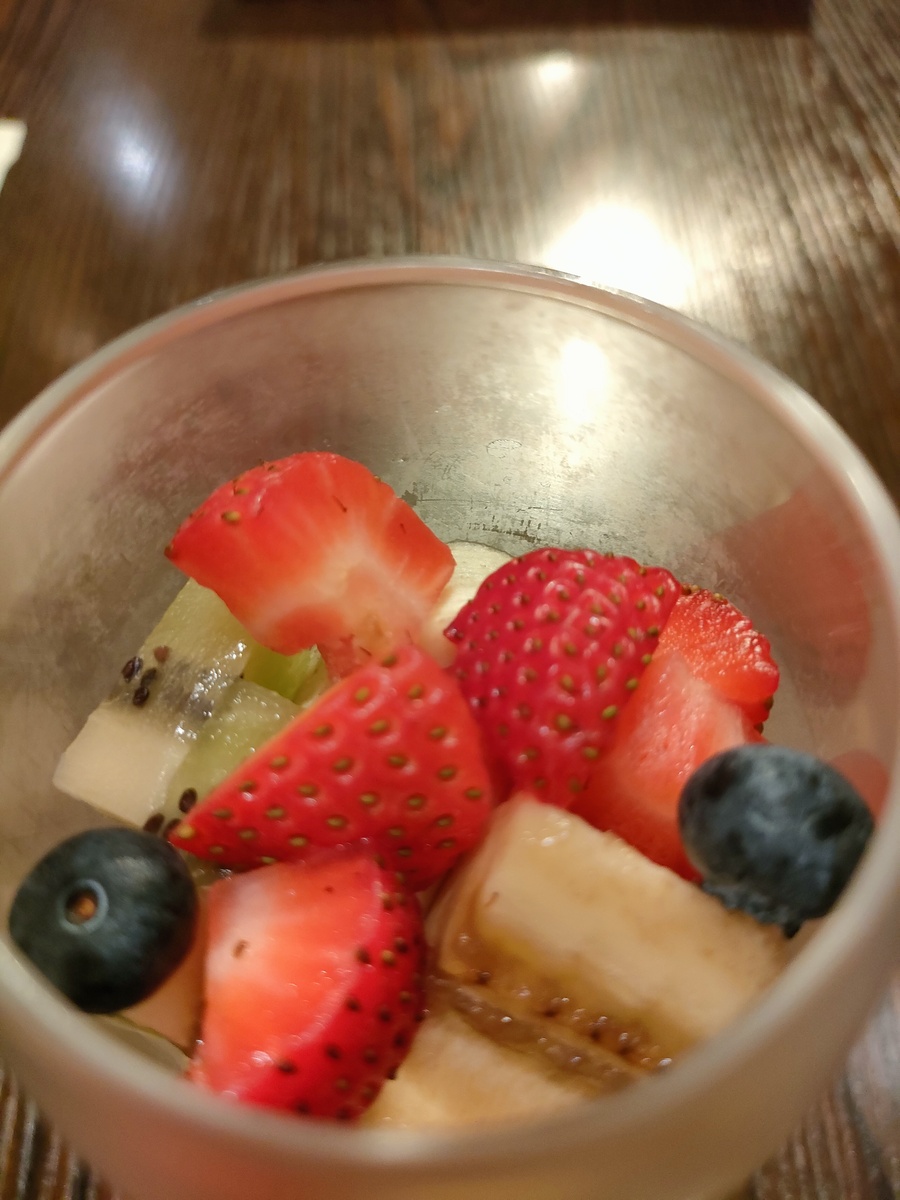 フルーツカスタードは、黒糖ベースのカスタードクリームの上に、色とりどりのフルーツが盛り付けられています。