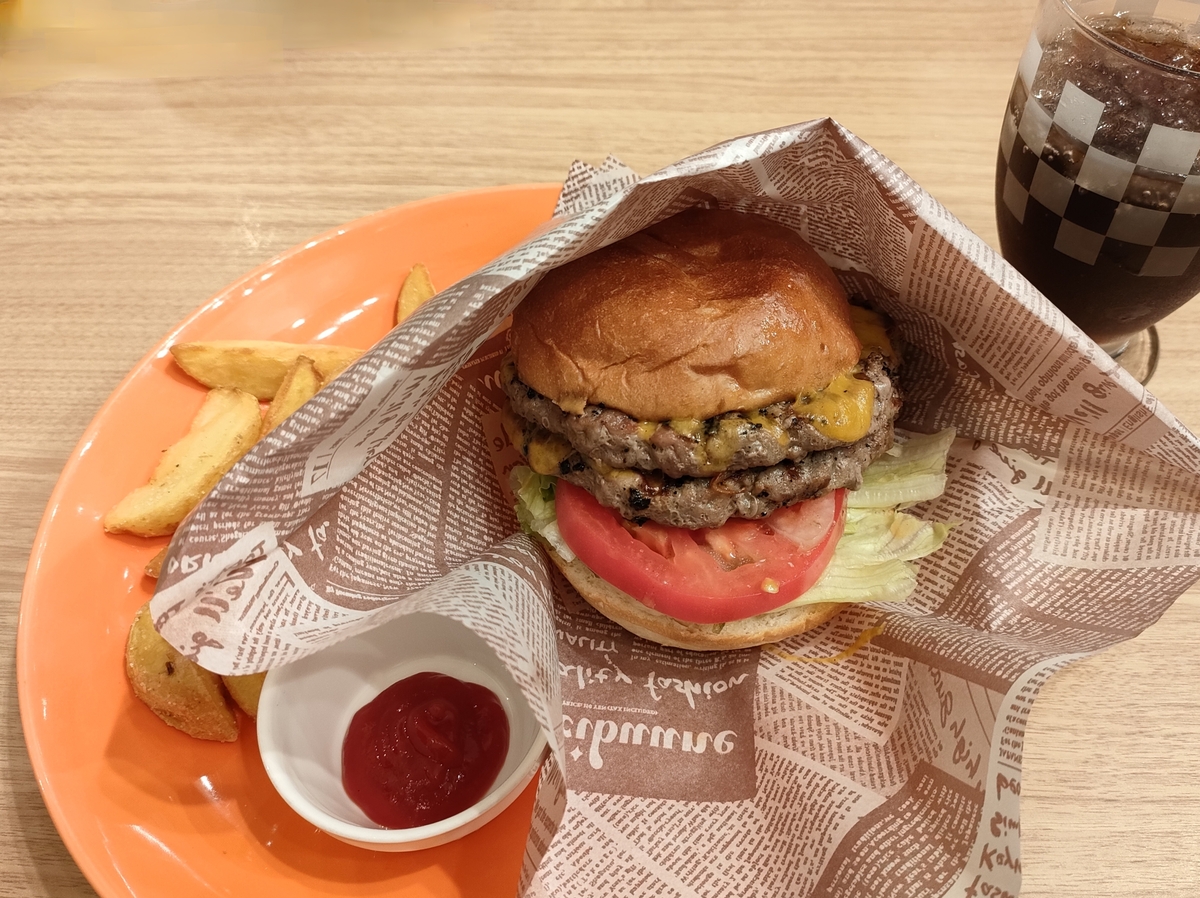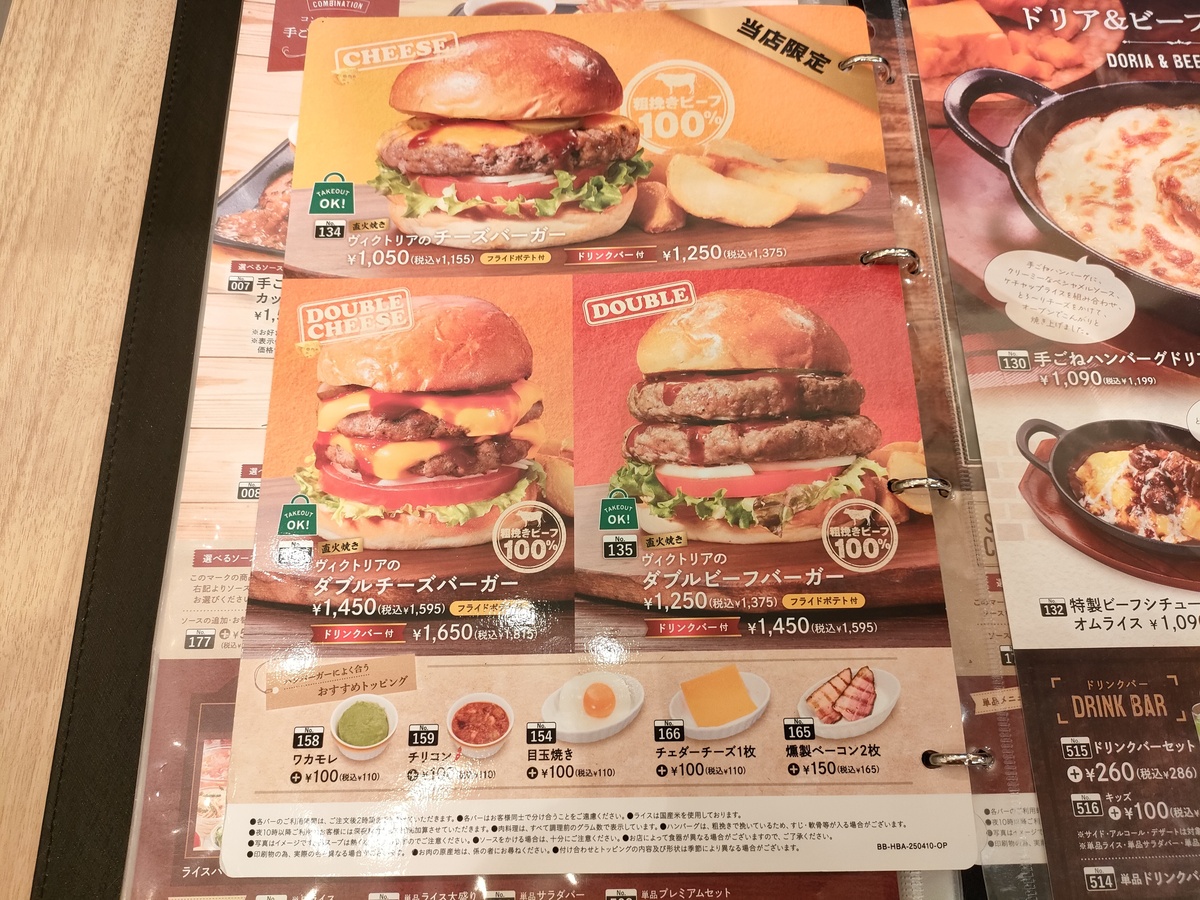そんなワケで今回は「ヴィクトリアのダブルチーズバーガー」ドリンクバー付(税込1650円)をオーダーしました。