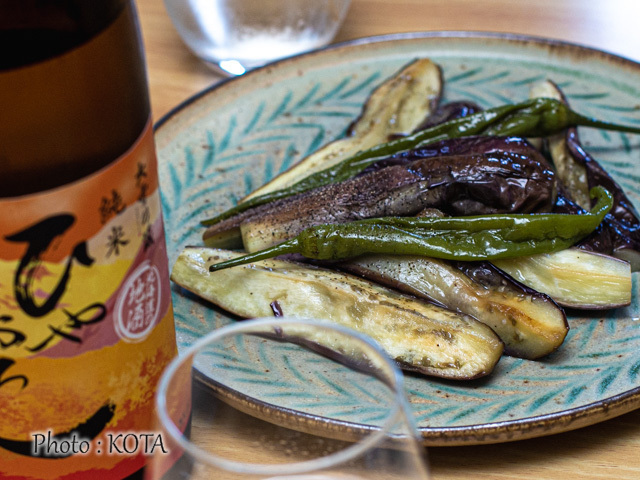 油で火を通したナス焼き。これを味わってからの大雪の蔵。おおっ、口のなかの油をさっぱりとしてくれ、茄子の深い旨味の、余韻までしっかり楽しませてくれる。