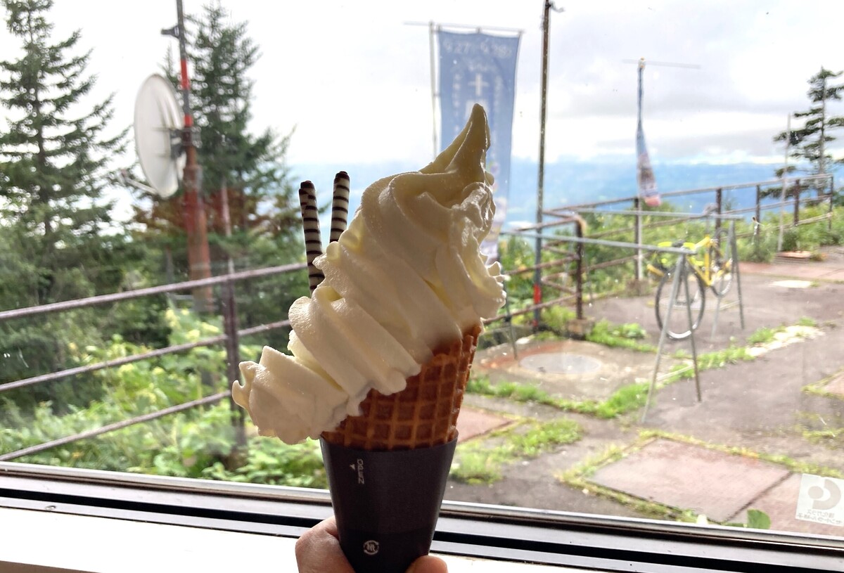 バランスを崩して慌てて手で掴んだ結果このような形に…。ずっしりとしてシャリ感の固めのソフトクリームなので全部落とさずに済みました(笑)
