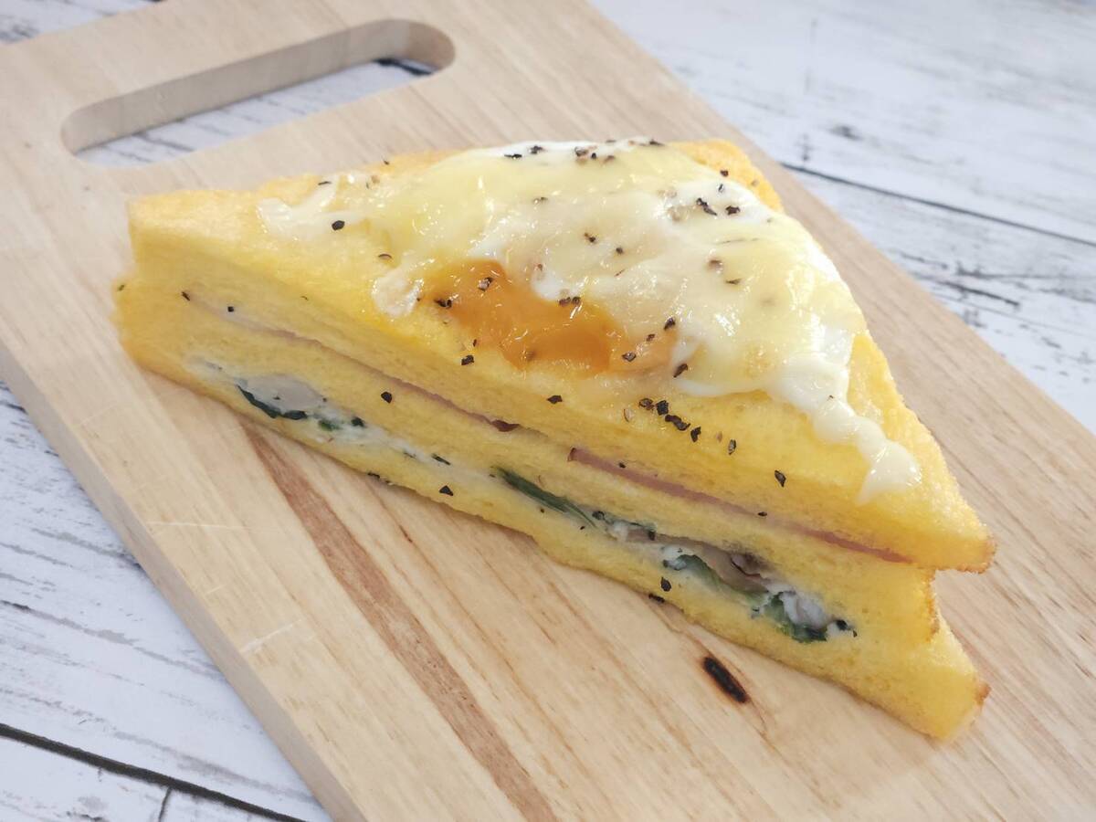 きのこフィリング、舞茸、ほうれん草、たまねぎ、ベーコンを挟んだ贅沢仕様のクロックムッシュ。