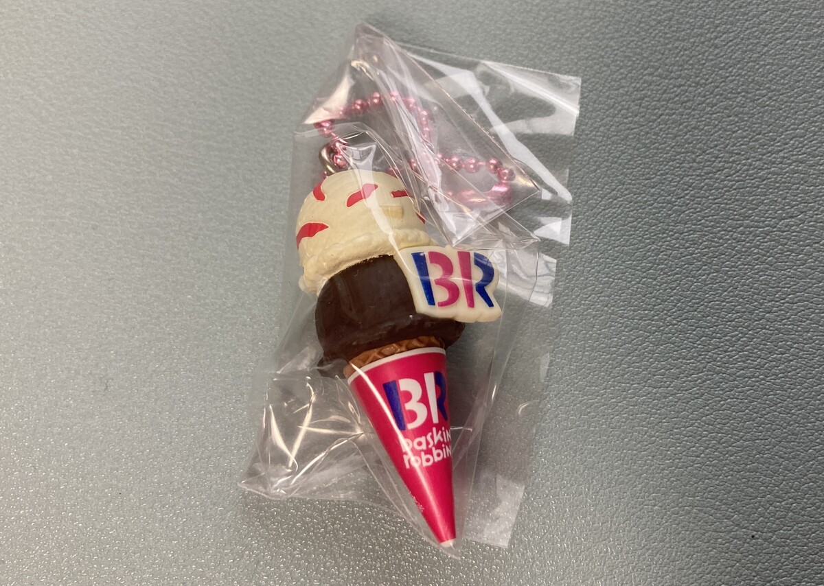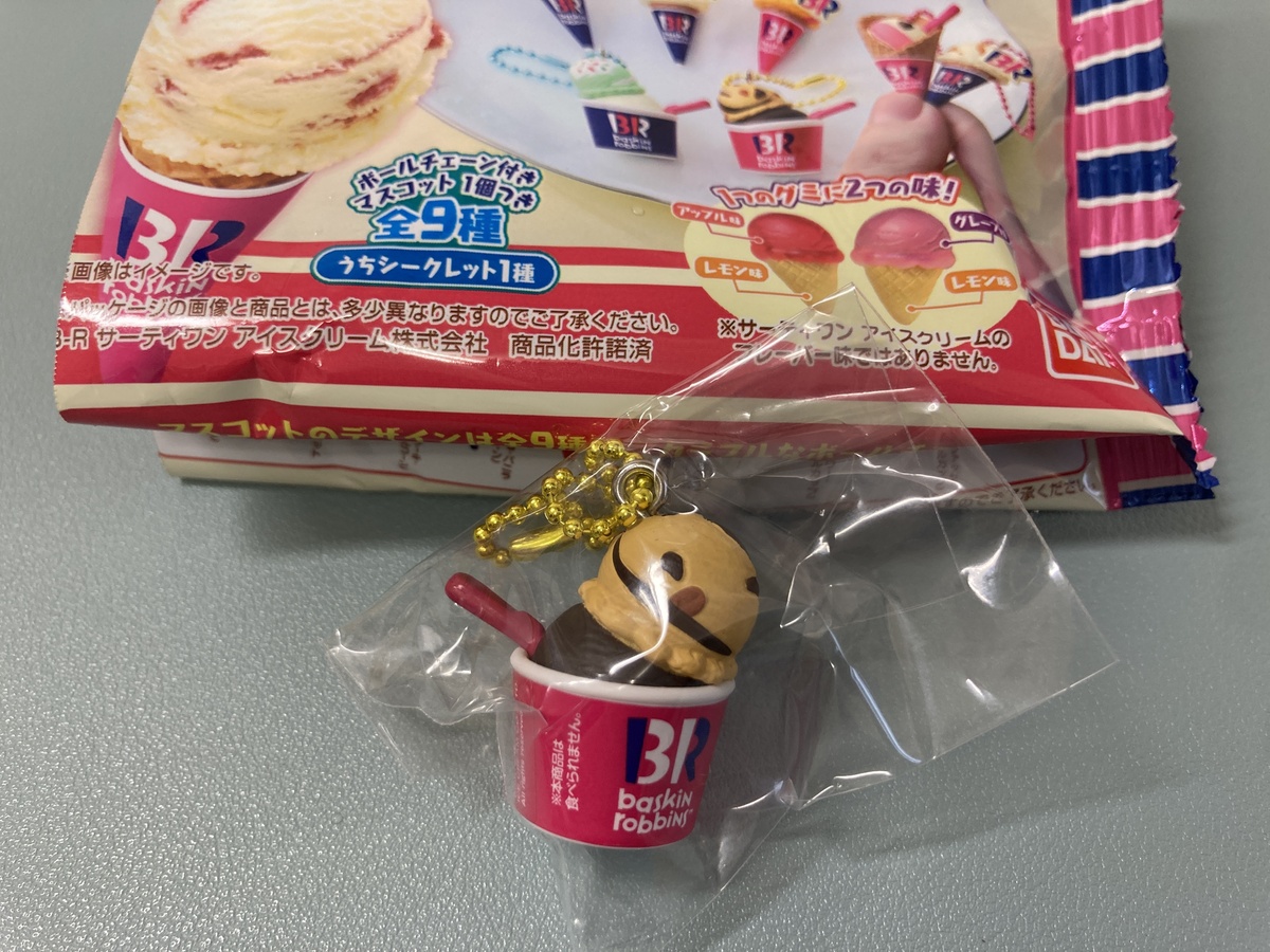 お菓子売り場で見つけた「サーティワン アイスクリーム マスコットつきグミ2」(税込385円)は、人気フレーバーがミニマスコットになったボールチェーン付きアイテムです。