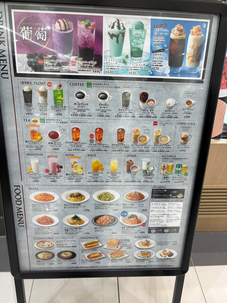 ドリンクの種類が豊富で、フードはパスタやピザ、サンドイッチやパンケーキ、ショーケースには美味しそうなケーキもならんでいました。