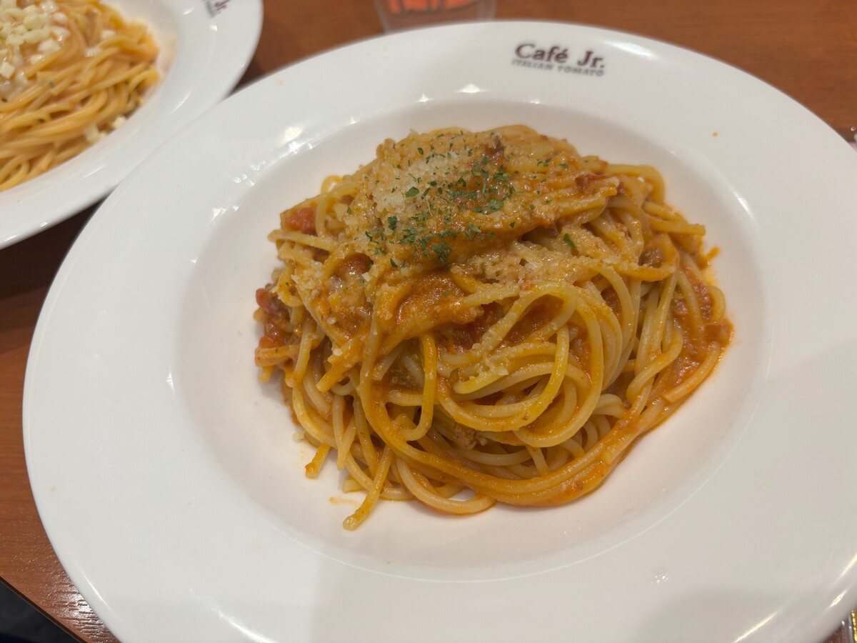 こちらも麺にミートソースがよく絡んでいて程よいトマトの酸味とひき肉の旨味がしっかりと感じられ、コクのある粉チーズもまろやかになり食べやすかったです。