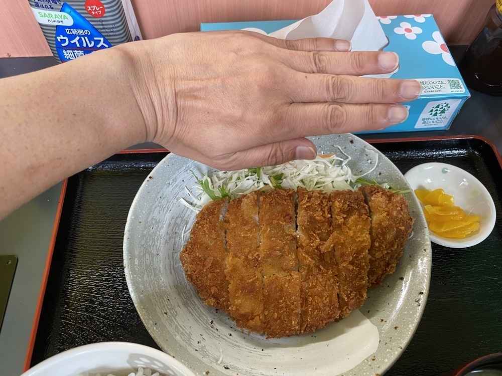 とんかつは、筆者の手とほぼ同じぐらいの大きさ。。衣はサクサクで、お肉はやわらかくてジューシーです。