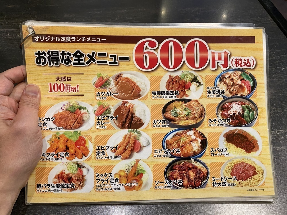 トンカツ定食やカキフライ定食、豚バラ生姜焼定食、特製唐揚定食、カツ丼、ミートソース特大盛など15種類のメニューがすべて税込み600円です。
