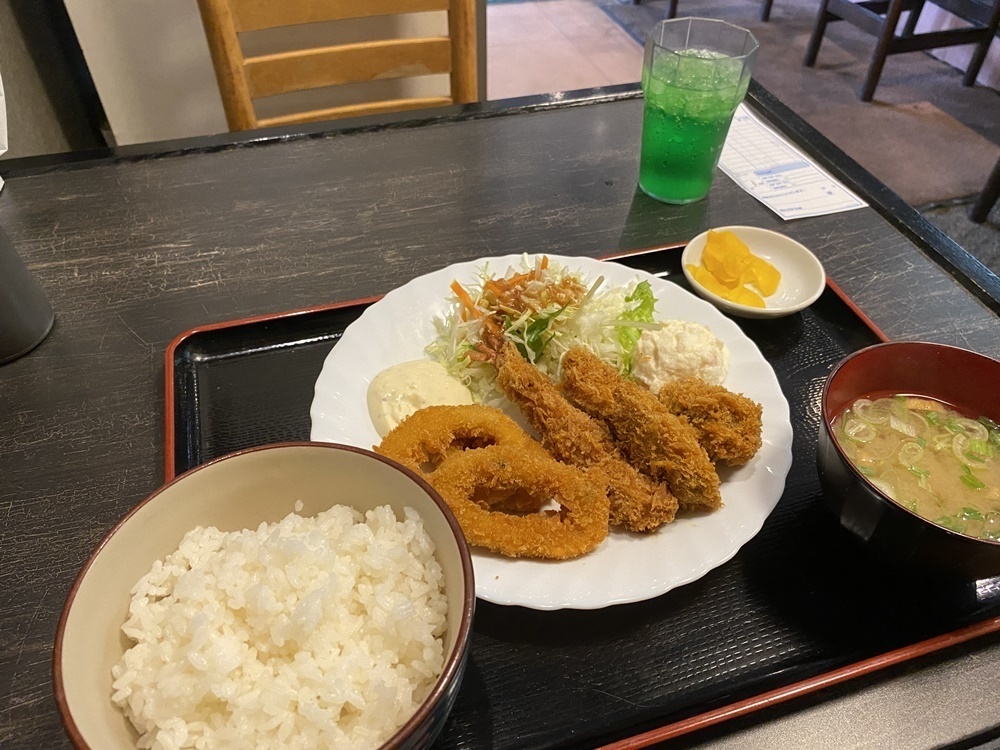 カキフライ3個とイカリングフライ3個、エビフライ1本がお皿の上にのっていました。カキフライは、濃厚でクリーミーな味わいで、口の中に海の香りが広がります。エビフライもイカリングフライも、その場で揚げているので衣がサクサク。