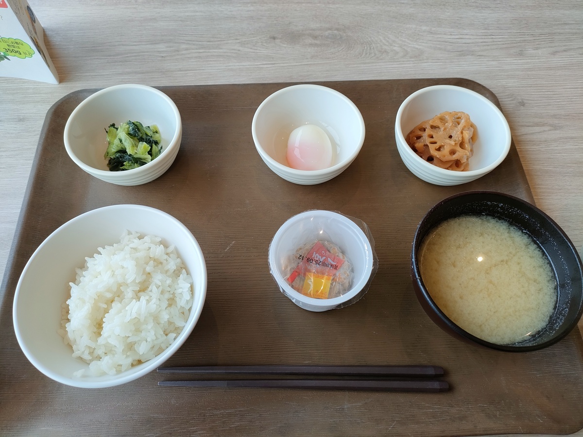 内容はご飯と味噌汁、小松菜のおひたし、温泉卵、れんこんのきんぴら、納豆です。