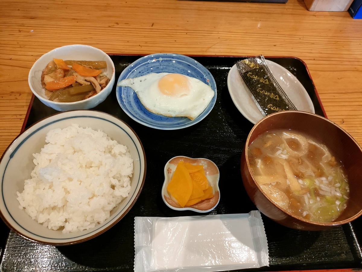 内容はご飯と味噌汁、フキの煮物、目玉焼き、味海苔、漬物です。
