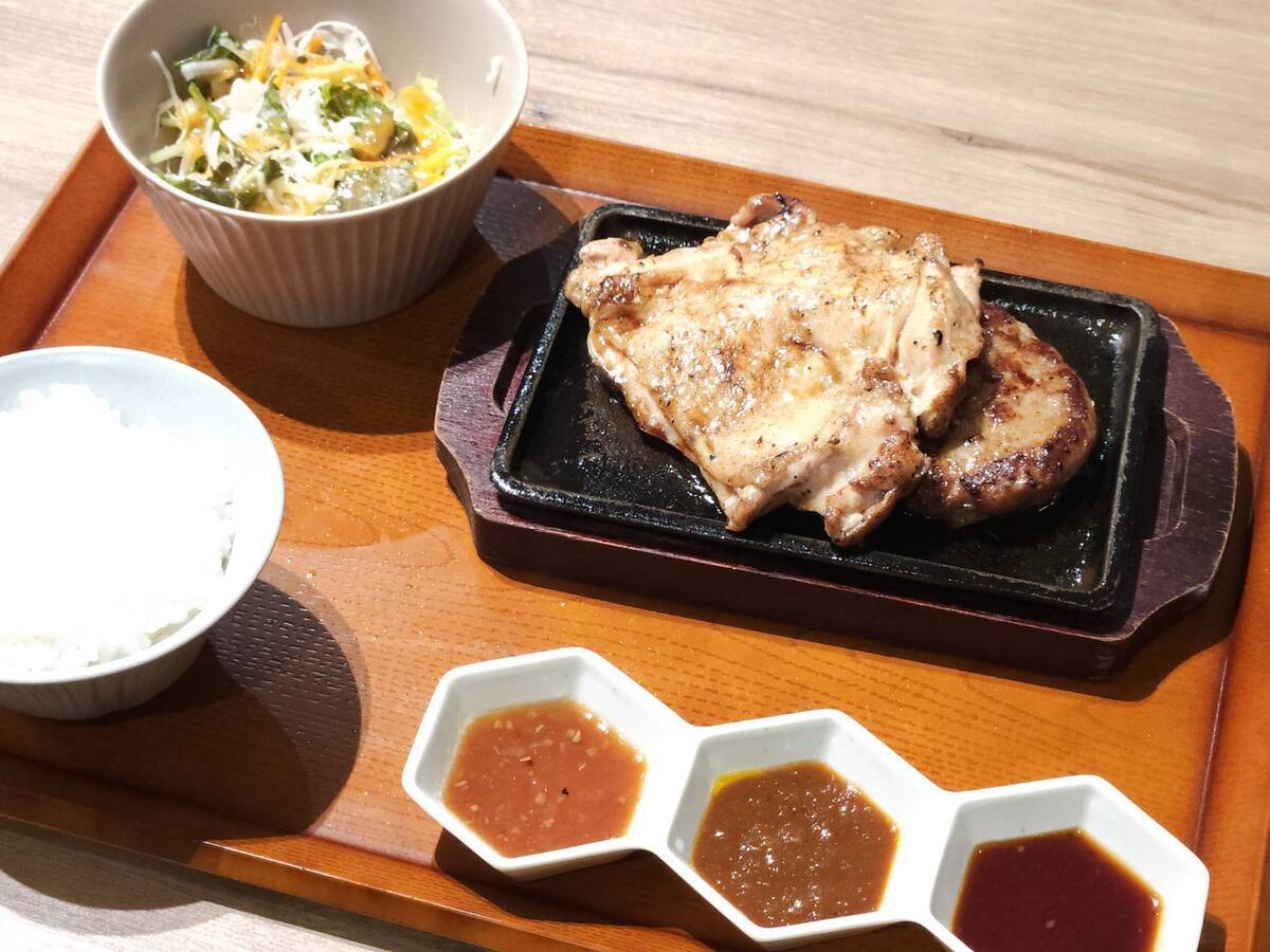 チキンのソースはガーリックトマト、てりマヨ、おろしポン酢の3種類から選ぶことができ、熱々の鉄板でジュージュー音を鳴らしながら運ばれてきます。