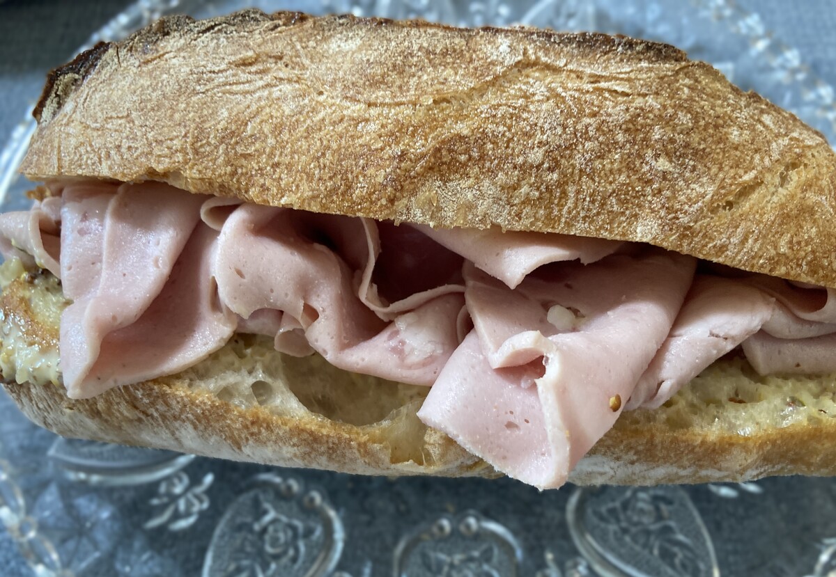 モルタデッラサンドの中身は、新十津川町のヴルストよしださんのモルタデッラ(イタリアのソーセージ)。