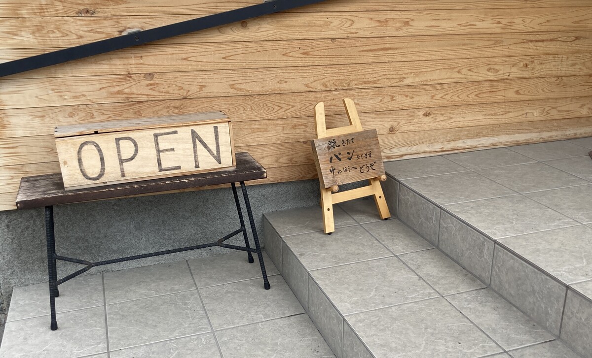 OPENの看板の横には「焼き立てパンあります」の文字が。これを見つけたらテンション上がりますよね。