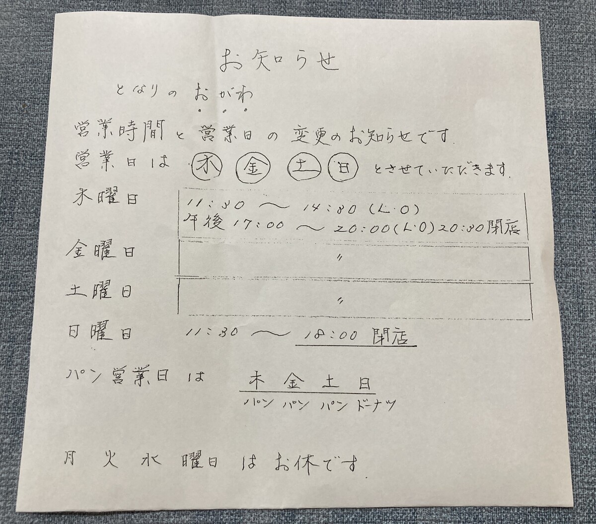 営業時間のお知らせや、手書きPOPの字が丁寧できれいでなんだか見ているだけで癒されます♪