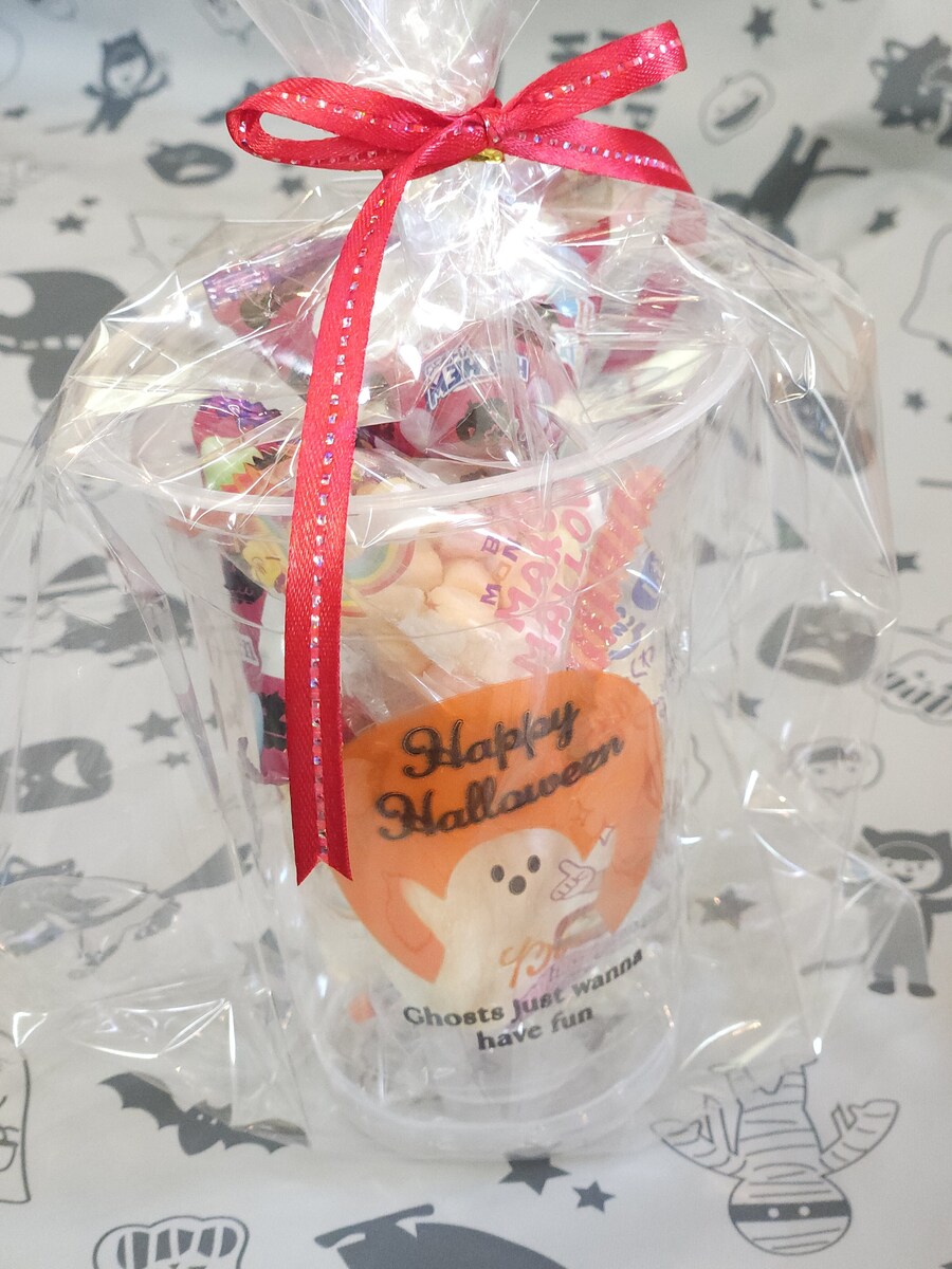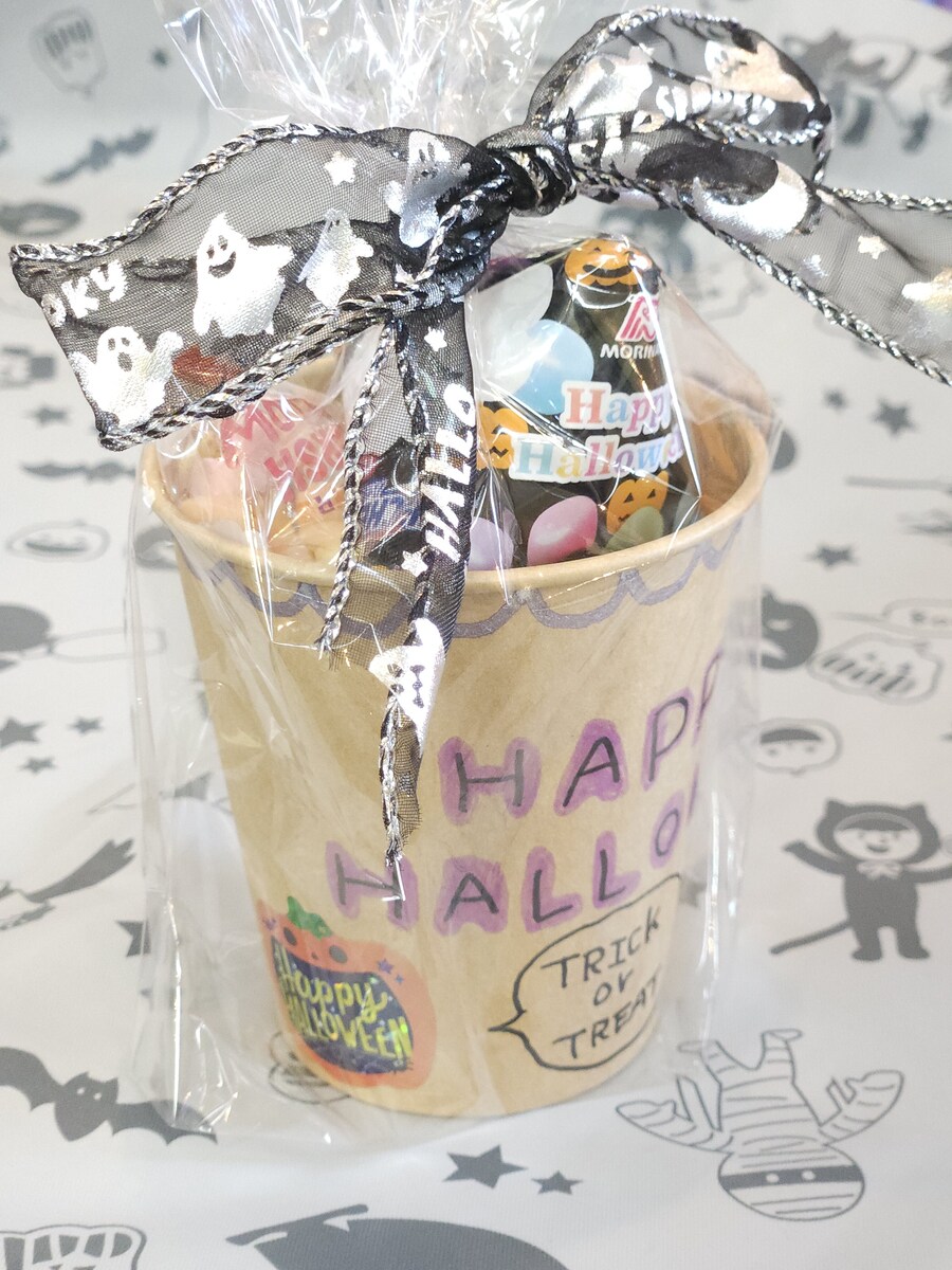 コップにお菓子を入れるだけでも可愛いのですが、ラッピングしてリボンを付けるとより特別感が増します♪